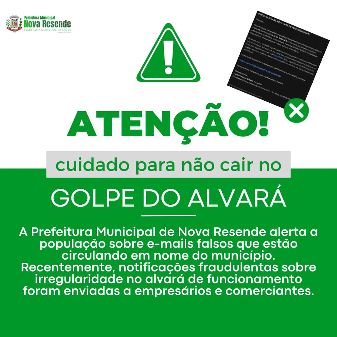 A Prefeitura Municipal de Nova Resende alerta a população sobre e-mails falsos que estão circulando em nome do município. Recentemente, notificações fraudulentas sobre irregularidade no alvará de funcionamento foram enviadas a empresários e comerciantes.